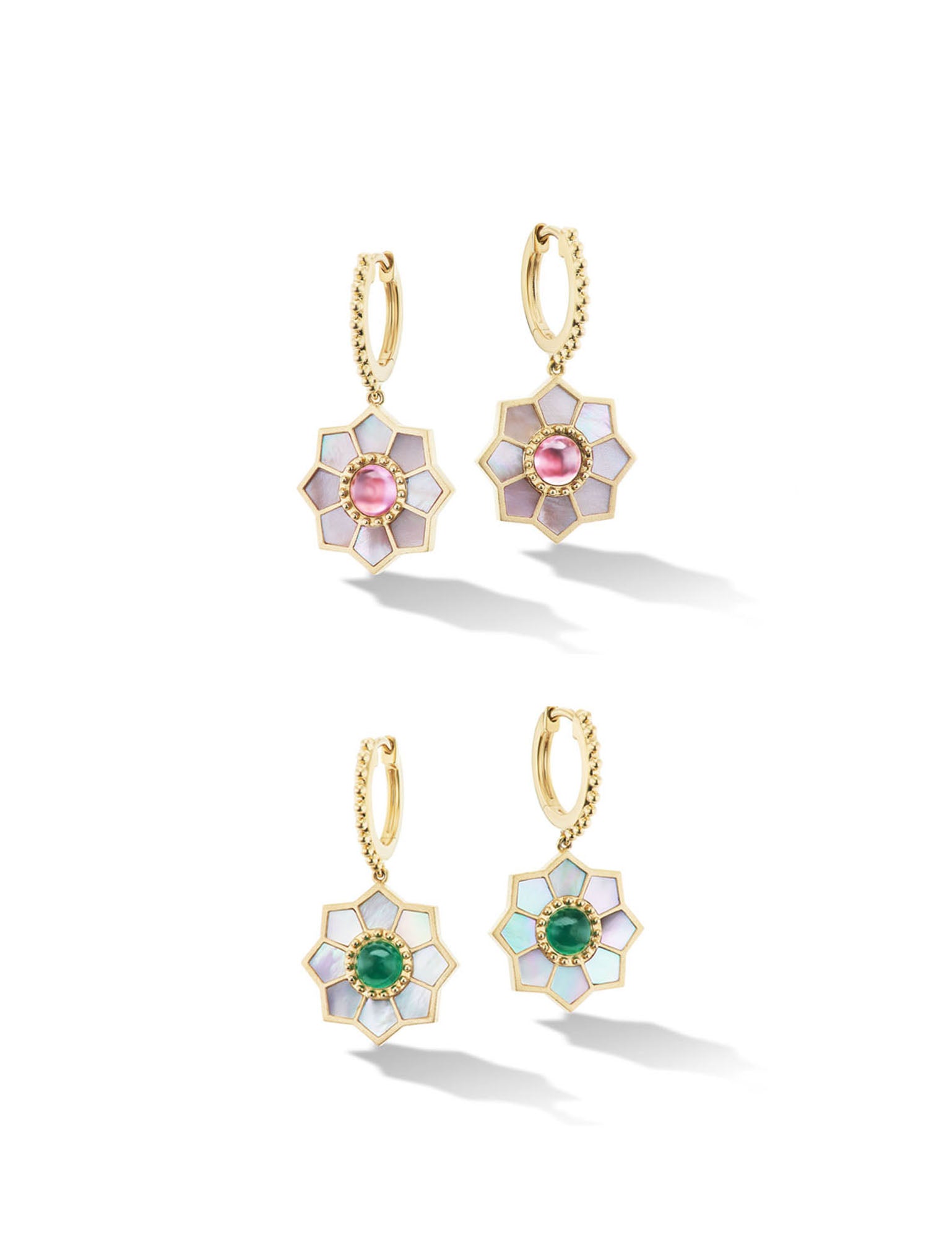 Fez Huggie earrings: Mysterious, exotic, and vibrant, our Fez Huggie Earrings derive their name from its Moroccan namesake. Inspired by the city Fez rich spiritual and cultural traditions, these huggies are timeless, colorful, and anchoring. Set in 18K yellow gold with stone inlay and cabochon center stone.
