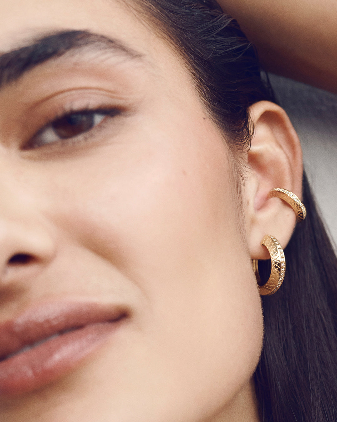 Our Tile Hoops are inspired by tile work in sacred temples. These hoops are available in Mama, Medium and Mini sizes.