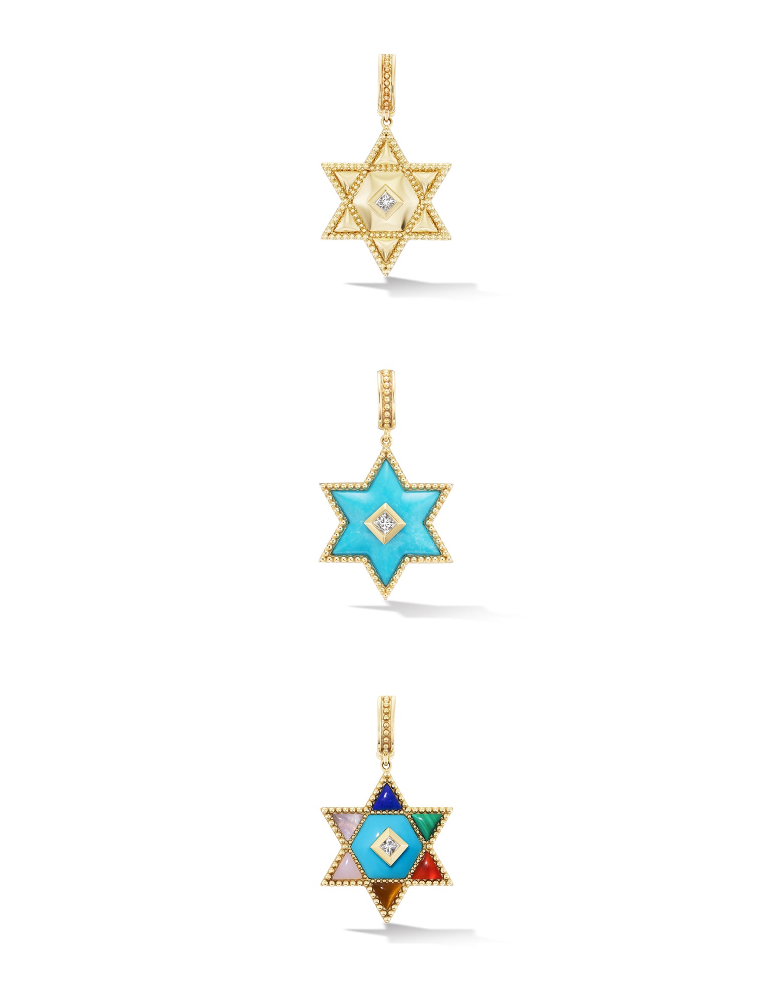 The Mini Star of David Pendant features two triangles symbolizing humanity’s connection to God: the upward triangle represents good deeds and divine goodness, while the downward triangle signifies God’s goodness toward humans.