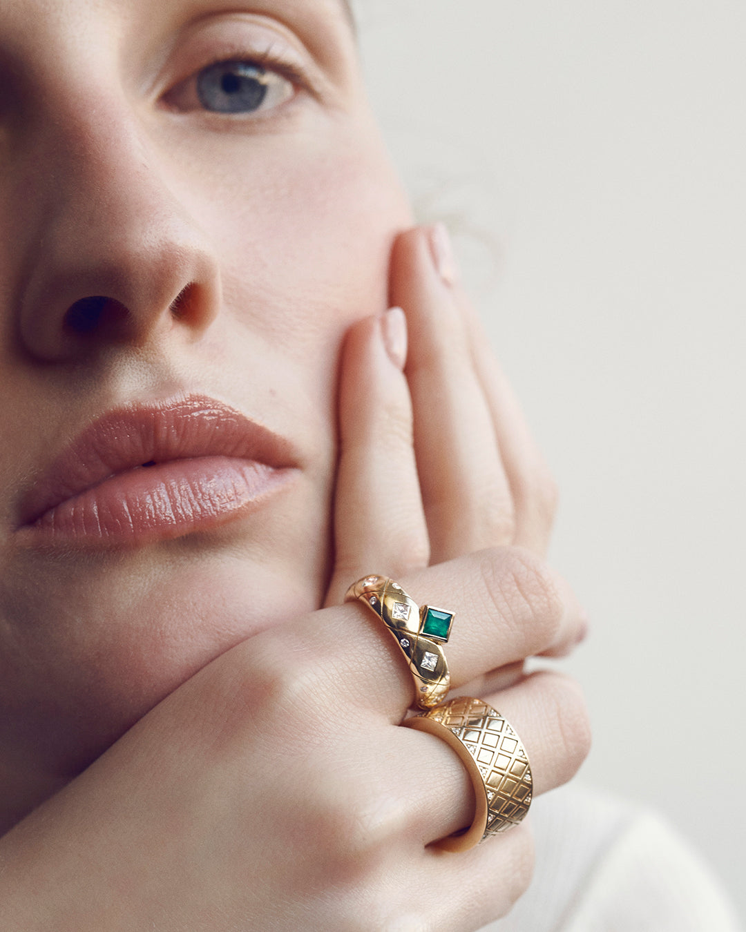 The Bliss Cigar Band, part of the Bliss Collection, blend elegance with contemporary design, inspired by a single lotus petal with geometric design. Meticulously crafted in 18K yellow gold, Diamonds and Emerald center stones.
