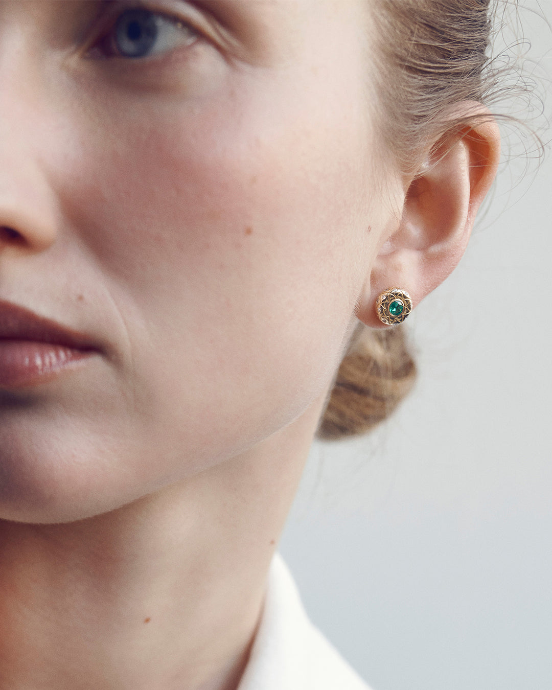 The Bliss Stud Earrings, part of the Bliss Collection, blend elegance with contemporary design, inspired by a single lotus petal with geometric design. Meticulously crafted in 18K yellow gold, Diamonds and Emerald center stones.