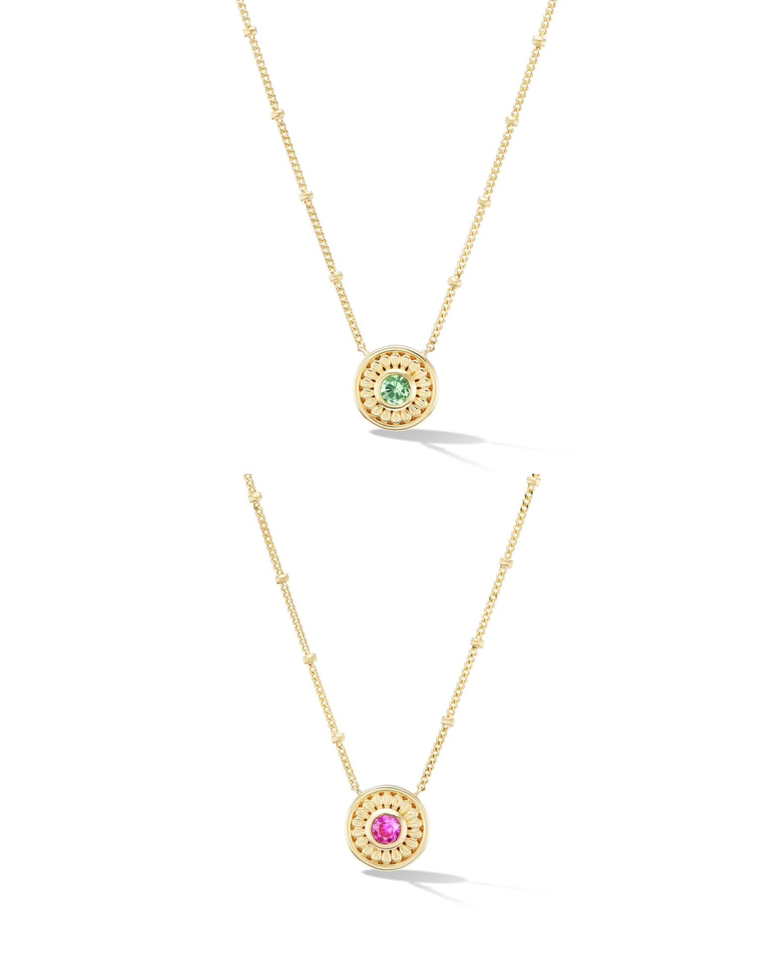 The Mini Mandala Necklace represents balance and harmony. This stunning piece is crafted from 18K yellow gold and is available with a choice of Pink Sapphire, Tsavorite, or Blue Topaz.