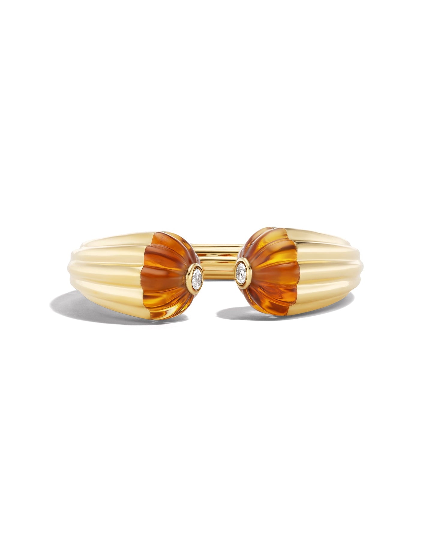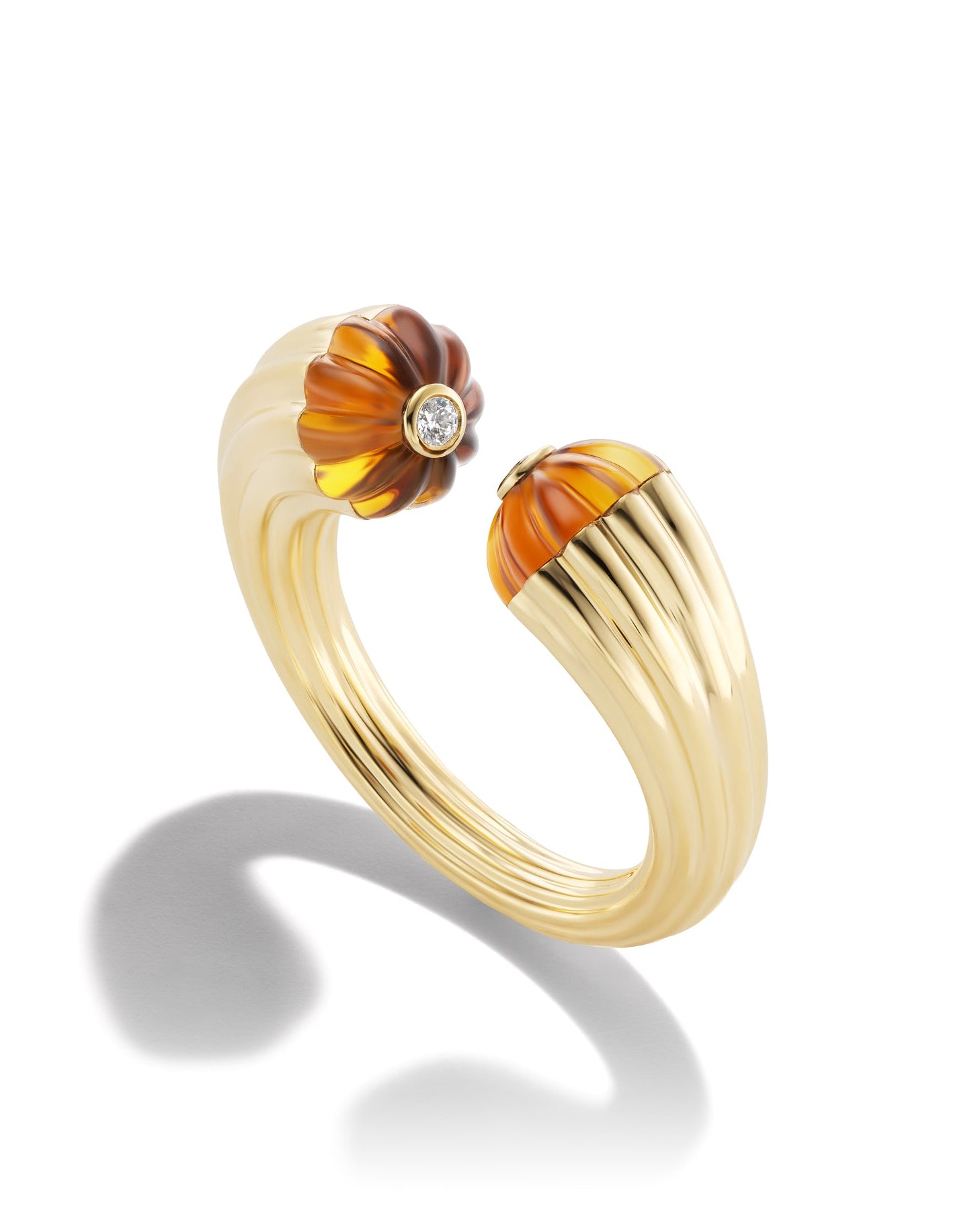 The Sol Collection is inspired by the warmth and energy of the sun. Each piece is crafted in 18k yellow gold and features carved stones that capture and reflect light in beautiful, natural ways.
