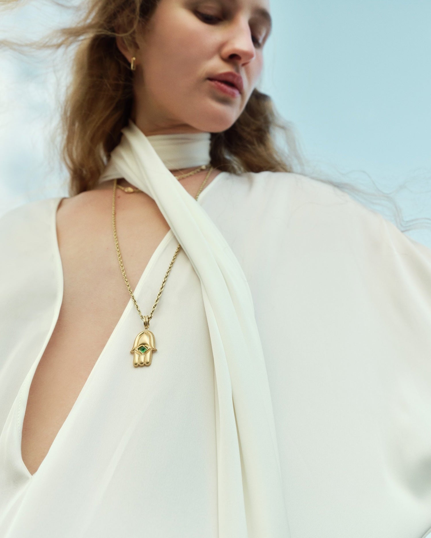 Inspired by ancient Middle Eastern mysticism, the Hamsa is known for its safe guarding protection properties. Called by many names including The Hand of God and the Hand of Fatima, It's believed to bring luck, protection, strength, health, and good fortune. Our Gold Hamsa Amulet is set with an Emerald Sugarloaf Cabochon.